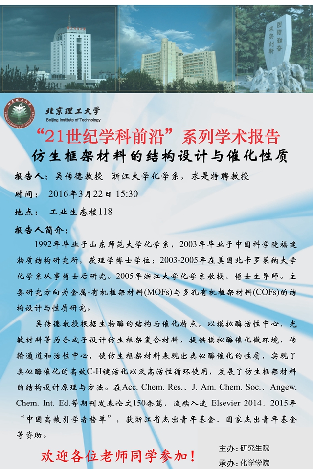 【化學(xué)學(xué)院】“21世紀(jì)學(xué)科前沿”吳傳德教授學(xué)術(shù)報(bào)告通知