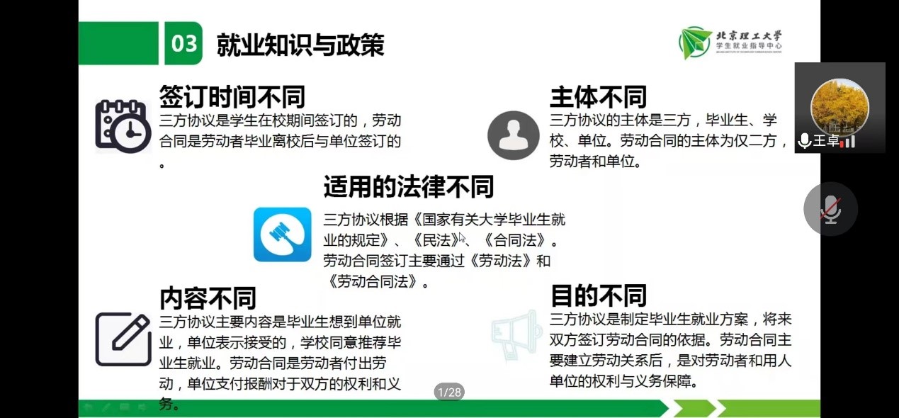 王卓老師從當(dāng)前就業(yè)形勢、就業(yè)知識與政策和簽訂就業(yè)協(xié)議書相關(guān)流程等多個方面為同學(xué)們展開講解。王卓老師指出,在畢業(yè)生人數(shù)逐年突破新高和往屆生疊加競爭的背景下,當(dāng)前就業(yè)形勢十分嚴(yán)峻。與此同時,新冠肺炎疫情還極大地提高了出國深造的不確定性,進一步增加了就業(yè)壓力。因此,在具體分析我校畢業(yè)生人數(shù),歷年就業(yè)情況,結(jié)合當(dāng)前就業(yè)形勢和當(dāng)下畢業(yè)生求職實際,王卓對2019級同學(xué)提出三點建議:一是結(jié)合自身能力,平衡就業(yè)心態(tài),對市場有清晰的認(rèn)識和了解,樹立正確的求職觀擇業(yè)觀;二是把握當(dāng)下機遇,正確制定規(guī)劃,當(dāng)前各項崗位需求未見明顯增加,先到先得;三是拓寬就業(yè)渠道,做好身份轉(zhuǎn)換,有效利用校、院等就業(yè)平臺,全身心投入準(zhǔn)備筆試面試。