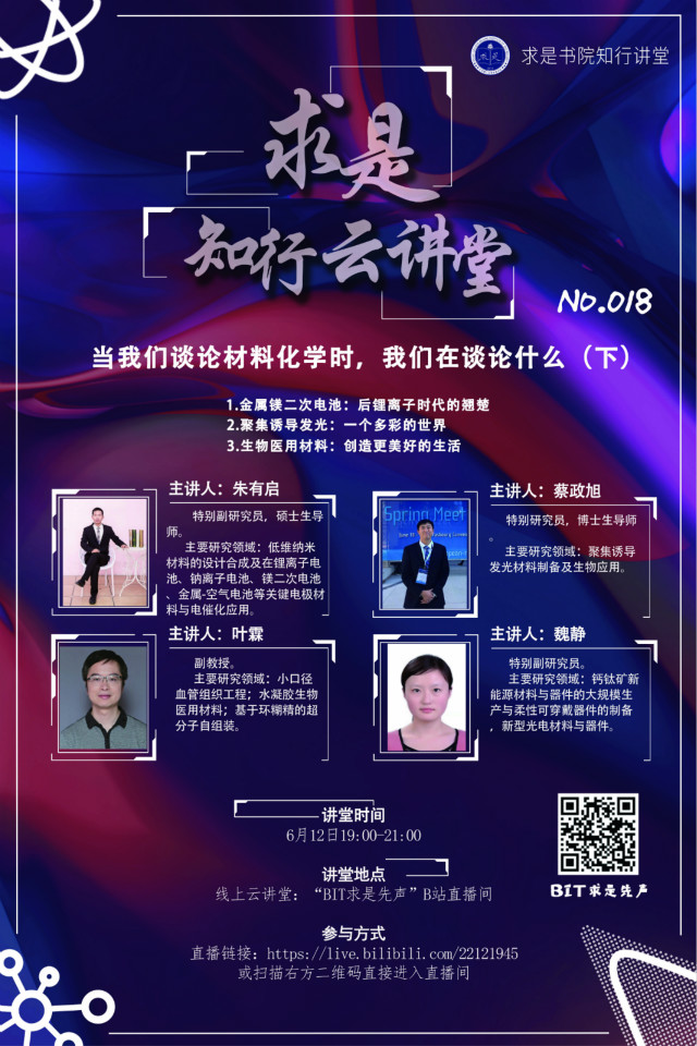帶著這些疑問(wèn),6月12日,求是書生在嗶哩嗶哩平臺(tái)聆聽了求是知行講堂第十八期——當(dāng)我們談?wù)摬牧匣瘜W(xué)時(shí),我們?cè)谡務(wù)撌裁矗浚ㄏ拢1酒谥性浦v堂繼續(xù)邀請(qǐng)到了材料學(xué)院材料物理與化學(xué)系的蔡政旭老師、葉霖老師、朱有啟老師和魏靜老師作為主講人,為大家講授關(guān)于材料化學(xué)的知識(shí),同時(shí)也向大家介紹材料物理與化學(xué)系,讓即將進(jìn)行專業(yè)選擇的大一新生對(duì)材料物理與化學(xué)系有了更深的了解。本次知行講堂由求是書院與材料學(xué)院合辦,材料物理與化學(xué)系承辦,分為上下兩期為求是書生進(jìn)行材料化學(xué)的科普講座。其中,第十七期——當(dāng)我們談?wù)摬牧匣瘜W(xué)時(shí),我們?cè)谡務(wù)撌裁矗浚ㄉ希┮呀?jīng)于6月5日舉辦。