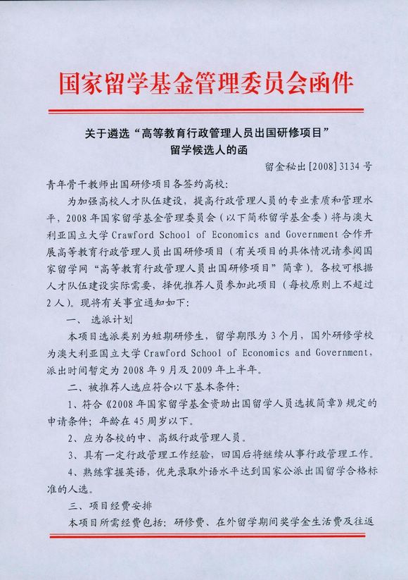 附件一:《關于遴選“高等教育行政管理人員出國研修項目”留學候選人的函》