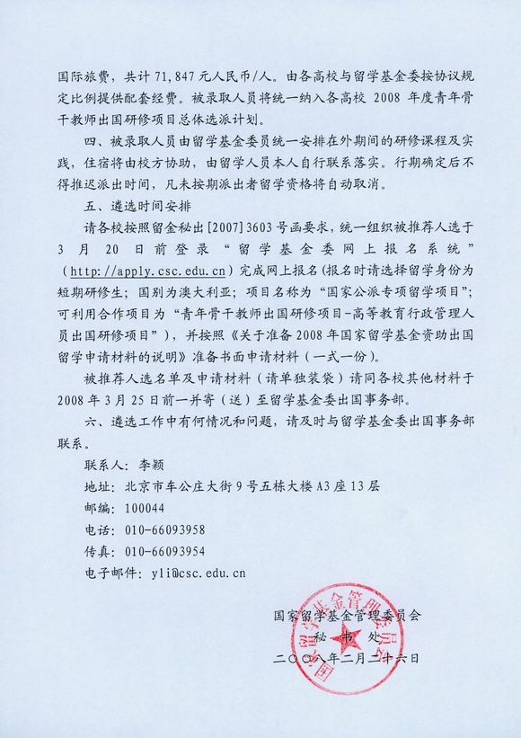 現(xiàn)將國家留學基金委《關于遴選“高等教育行政管理人員出國研修項目”留學候選人的函》轉發(fā)給你們,請結合本單位實際,認真組織申報工作。申報人員請?zhí)顚憽侗本├砉ご髮W行政管理人員出國研修申報表》,并附相關證明材料復印件,于2008年3月6日前送交黨委組織部。