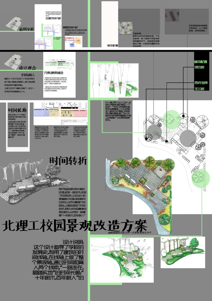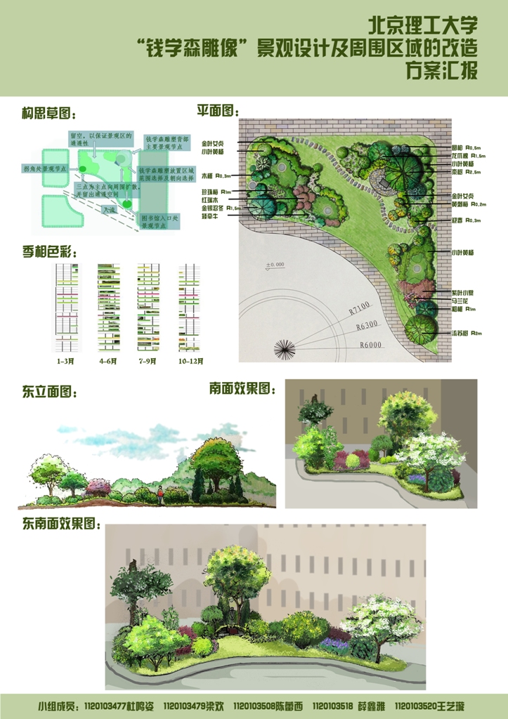 本次展出的方案,作者均為設(shè)計(jì)學(xué)院環(huán)境藝術(shù)設(shè)計(jì)系2010級(jí)本科生,在專業(yè)老師的指導(dǎo)下,學(xué)生們將校園景觀改造與城市公共空間景觀設(shè)計(jì)、植物景觀設(shè)計(jì)課程學(xué)習(xí)相結(jié)合。在大學(xué)生校園景觀需求調(diào)研、校園植物分析、錢(qián)學(xué)森像及周邊環(huán)境分析的基礎(chǔ)上,組成七個(gè)設(shè)計(jì)小組分別開(kāi)展方案設(shè)計(jì)。所展出的五組方案,通過(guò)五個(gè)不同方向的設(shè)計(jì)嘗試——小廣場(chǎng)主題、植物群落主題、微地形主題、時(shí)間寓意主題以及思想迸發(fā)主題為立意展開(kāi)錢(qián)學(xué)森像的遷移改造景觀設(shè)計(jì),以求創(chuàng)造美好的校園景觀環(huán)境,對(duì)北京理工大學(xué)的校園景觀改造作出自己的貢獻(xiàn)。