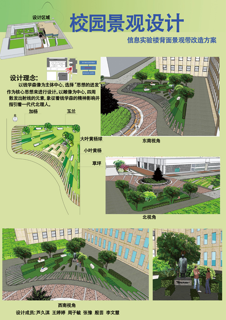 為了進(jìn)一步做好校園環(huán)境建設(shè),黨委宣傳部聯(lián)合設(shè)計(jì)藝術(shù)學(xué)院,以我校錢(qián)學(xué)森雕塑新址小環(huán)境設(shè)計(jì)為主要內(nèi)容,將學(xué)校工作與學(xué)生培養(yǎng)工作結(jié)合,積極發(fā)揮設(shè)計(jì)學(xué)院環(huán)境藝術(shù)設(shè)計(jì)方面的專業(yè)力量,組織了本次方案設(shè)計(jì)活動(dòng)。