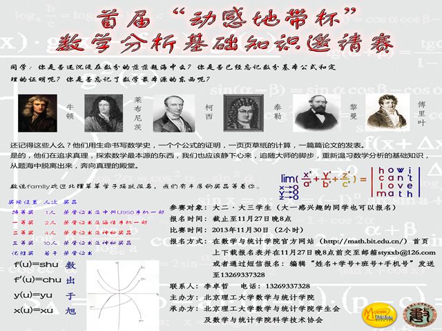 2013年北京理工大學(xué)數(shù)學(xué)與統(tǒng)計(jì)學(xué)院數(shù)學(xué)競(jìng)賽首屆“動(dòng)感地帶杯”數(shù)學(xué)分析基礎(chǔ)知識(shí)邀請(qǐng)賽開始報(bào)名了!邀請(qǐng)賽將于2013年11月30日(星期六)九點(diǎn)至十二點(diǎn)在良鄉(xiāng)校區(qū)(具體地點(diǎn)待定 )舉行,參賽學(xué)生以全校大二大三學(xué)生為主,大一學(xué)生為輔。
