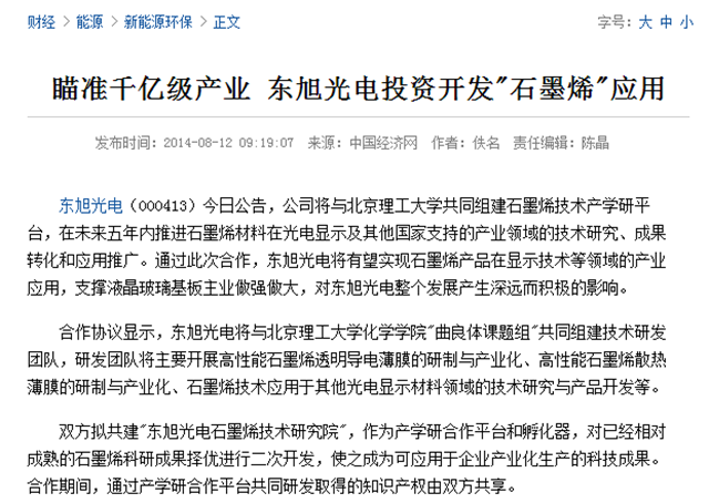 原標(biāo)題:瞄準千億級產(chǎn)業(yè) 東旭光電投資開發(fā)"石墨烯"應(yīng)用