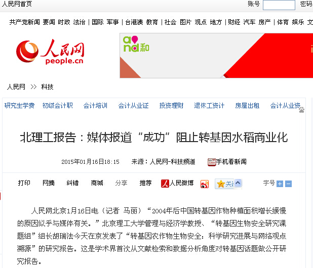 “2004年后中國(guó)轉(zhuǎn)基因作物種植面積增長(zhǎng)緩慢的原因似乎與媒體有關(guān)。”胡瑞法提出。他認(rèn)為,某周刊在當(dāng)年底報(bào)道了兩種轉(zhuǎn)基因水稻品種獲“國(guó)家農(nóng)業(yè)轉(zhuǎn)基因生物安全委員會(huì)”的安全認(rèn)證一事,“不僅‘成功’地阻擋了上述兩個(gè)轉(zhuǎn)基因水稻的商業(yè)化,同時(shí)也使轉(zhuǎn)基因農(nóng)產(chǎn)品的安全性逐漸成為更廣大的大眾關(guān)心的熱門(mén)話(huà)題”。