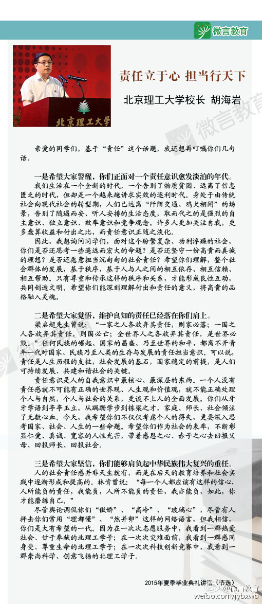 【編者按】6月29日學(xué)校2015屆本科生畢業(yè)典禮暨學(xué)位授予儀式上,北理工校長胡海巖院士作了題為《責(zé)任立于心,擔(dān)當(dāng)行天下》的致辭,人民網(wǎng)、光明日報、教育部微言教育等多家主流媒體轉(zhuǎn)載或轉(zhuǎn)發(fā)。校長致辭不僅是對畢業(yè)生的臨別贈言,也代表了一所大學(xué)對全體學(xué)子在人格品行、學(xué)養(yǎng)修為上的殷殷期盼,亦是對我校校訓(xùn)“德以明理 學(xué)以精工”的生動解讀。宣傳部對相關(guān)報道進(jìn)行搜集整理,希望引發(fā)全體師生員工學(xué)習(xí)思考。