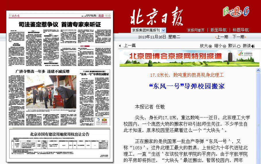 【北京日?qǐng)?bào)】“東風(fēng)一號(hào)”導(dǎo)彈校園搬家