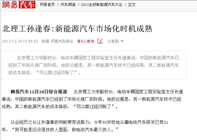 【網(wǎng)易汽車】北理工孫逢春:新能源汽車市場化時機成熟