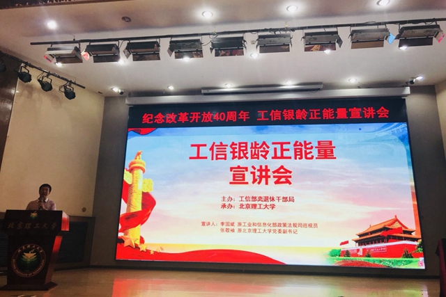 編輯:辛麗春 審核:蔡婷婷 閱讀次數(shù):今年是全面貫徹落實黨的十九大精神的開局之年,也是改革開放40周年。為進一步發(fā)揮離退休干部獨特優(yōu)勢,為黨和人民的事業(yè)增添正能量,9月21日下午,由工信部離退休干部局主辦、北京理工大學(xué)承辦的“憶改革,話改革,促改革”工信銀齡正能量宣講活動在我校成功舉辦。工信部離退休干部局副局長陳茹,工信部離退休干部局組織協(xié)調(diào)處處長呂堅;北京理工大學(xué)副校長李和章,原北京理工大學(xué)常務(wù)副校長、校關(guān)工委主任楊賓,校離退休工作領(lǐng)導(dǎo)小組成員單位負(fù)責(zé)人,離退休教職工代表以及學(xué)生代表二百余人共同聆聽了此次宣講報告會。
