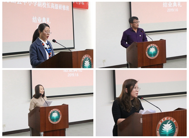 結(jié)業(yè)儀式上各參會(huì)領(lǐng)導(dǎo)為學(xué)員們頒發(fā)了結(jié)業(yè)證書;六位學(xué)員小組組長分別以《感悟中成長-扮演好自己的角色》《開發(fā)校本特色的德育活動(dòng) 開展卓有成效的德育教育》《如何有效的開展家校合作》 、關(guān)于小學(xué)生心理健康教育的思考》《淺談小學(xué)班級(jí)管理》和《如何有效開展幼兒園區(qū)域活動(dòng)》為題作了主題報(bào)告。