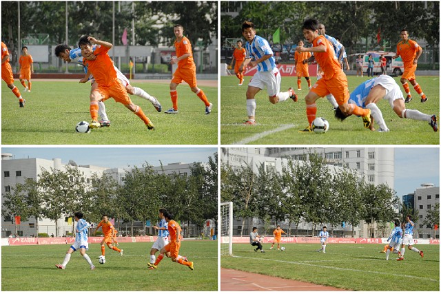 開場僅5分鐘,北理工左路發(fā)動進攻,邊路球員楊陽突破至底線將球傳入禁區(qū),中路包抄的荷蘭外援埃米爾推射得分為北理工首開記錄,1:0。18分鐘鄒捷中路接球后,擺脫兩名防守隊員起腳射門,北理工后衛(wèi)奮力擋出。第25分鐘,沈陽隊李根開出前場任意球,外援23號保羅頭球一蹭險些扳平場上比分。